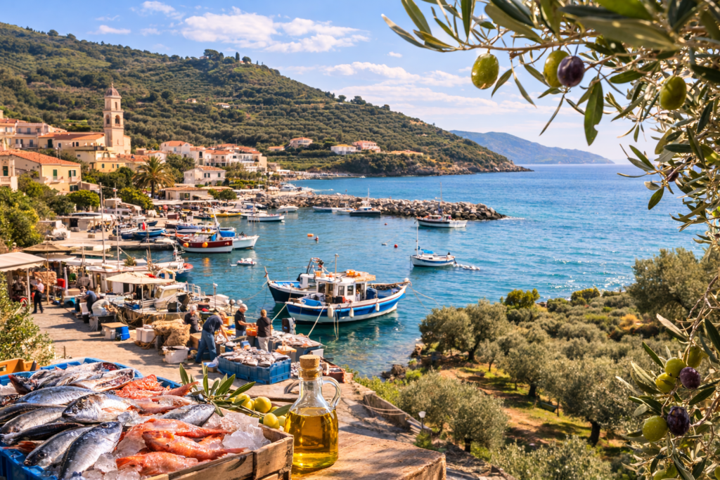 朝、港に魚が並び、